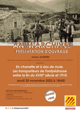 Dans le cadre de son événement “Animarchives”, les archives départementales de perpignan accueillent Adrien Barrere pour une présentation de son livre “En charrette et à dos de mule“.